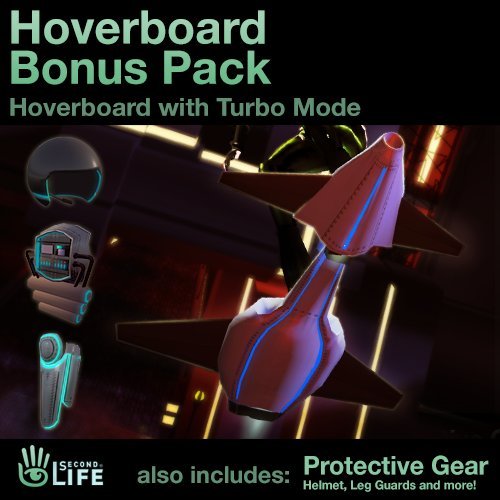 Explore the vast expanses of Second Life with the Hoverboard Bonus Pack. It features a high performance designer Hoverboard with a blistering turbo mode, and an original set of futurist protective gear that includes a helmet, jacket, pants, leg guards, backpack, and bracer.